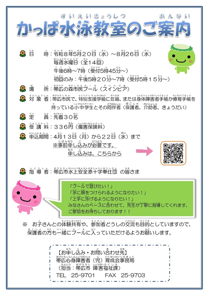 帯広市在住の心身に障害のある児童・生徒を対象とした水泳教室です。